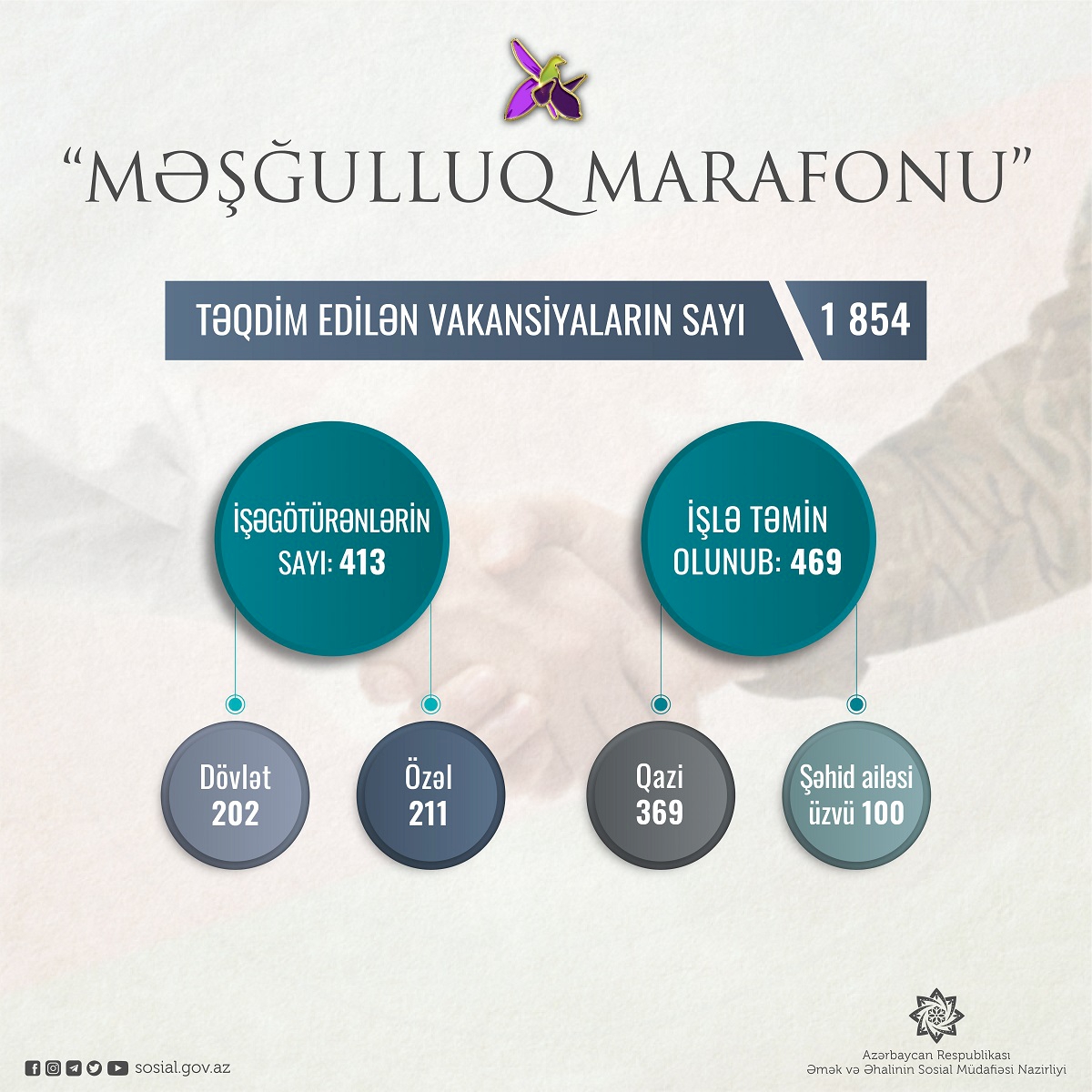 Marafonda iştirak edən işəgötürənlərin sayı artıq 413-ə çatıb. 202-si dövlət, 211-i özəl müəssisələr olan həmin işəgötürənlər tərəfindən marafona 1854 vakansiya təqdim edilib. Bu vakansiyalar üzrə artıq 469 şəhid ailəsi üzvü və qazi işlə təmin olunub. Onlardan 369-u qazi, 100-ü şəhid ailəsi üzvləridir.