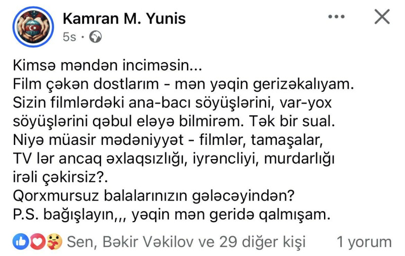 O, “Kimsə məndən inciməsin... Film çəkən, dostlarım, mən yəqin gerizəkalıyam. Sizin filmlərdəki ana-bacı söyüşlərini, var-yox söyüşlərini qəbul edə bilmirəm. Tək bir sual. Niyə müasir mədəniyyət - filmlər, tamaşalar, TV- lər ancaq əxlaqsızlığı, iyrəncliyi, murdarlığı təbliğ edir? Qorxmursuz balalarınızın gələcəyindən? Bağışlayın, yəqin mən geridə qalmışam”, yazıb.