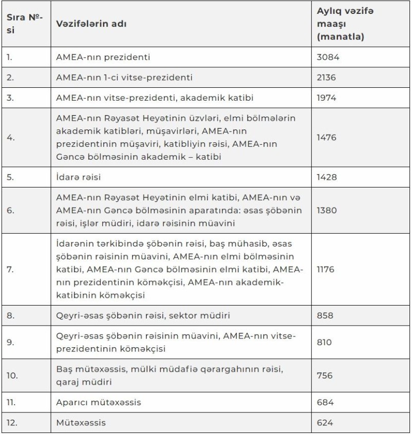 Belə ki, AMEA prezidentinin aylıq vəzifə maaşı 2570 manatdan 3084 manata, AMEA-nın 1-ci vitse-prezidentinin 1780 manatdan 2136 manata, AMEA-nın vitse-prezidenti, akademik katibinin 1645 manatdan 1974 manata, AMEA-nın Rəyasət Heyətinin üzvləri, elmi bölmə- lərin akademik katibləri, müşavirləri, AMEA-nın prezidentinin müşaviri, katibliyin rəisi, AMEA-nın Gəncə bölməsinin akademik – katibinin aylıq vəzifə maaşı 1230 manatdan 1476 manata, İdarə rəisinin maaşı isə 1190 manatdan 1428 manata qaldırılıb.