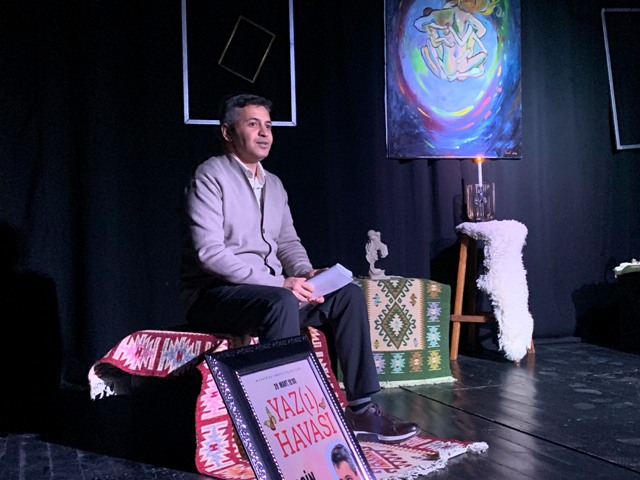 Maleviçin qara kvadratının içindəyik. Birazdan bu qara kvadratı dəyərə, mənaya mindirən şairin özü səhnəyə təşrif buyurur. Şamı görən Aqşin Yenisey “Füzuli də şam işığında şeir yazırdı” deyib ayaqüstü Füzuliyə sataşır, zal gülüşür, şeir gecəsi başlayır.