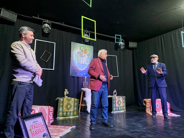 Adamlar söykənəcəksiz taxta skamyalarda öz yerlərini tuturlar. Mən isə qıçlarımı biraz gen açıb həm öz, həm də müdirim Aqil Abbasın yerini tuturam. Üç addım o yana, üç addım da bu yana eni olan qaranlıq səhnənin hər iki başı çərçivədə Aqşin Yeniseyin şəkli və tədbirin adı – “Yaz(ı) havası” ilə dekorasiya edilib. Səhnənin ortasına bir şam, kənarlarda da kvadrat oturacaqlar. Vidadi Həsənov içəri girib zaldan soruşur: