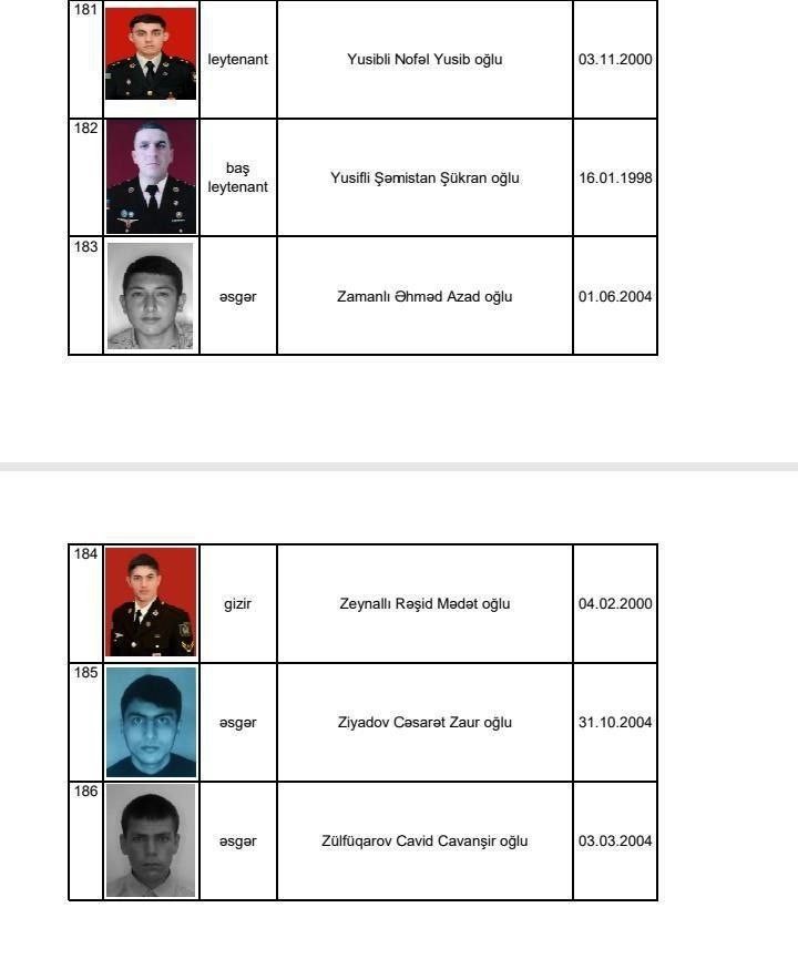 Bundan əvvəl 192 şəhid hərbçinin adı açıqlanıb. Şəhid olmuş hərbçilərdən 180 nəfər Müdafiə Nazirliyinin, 12 nəfər isə Daxili İşlər Nazirliyinin hərbi qulluqçularıdır. Şəhid olanlardan 1 nəfər də mülki şəxsdir.