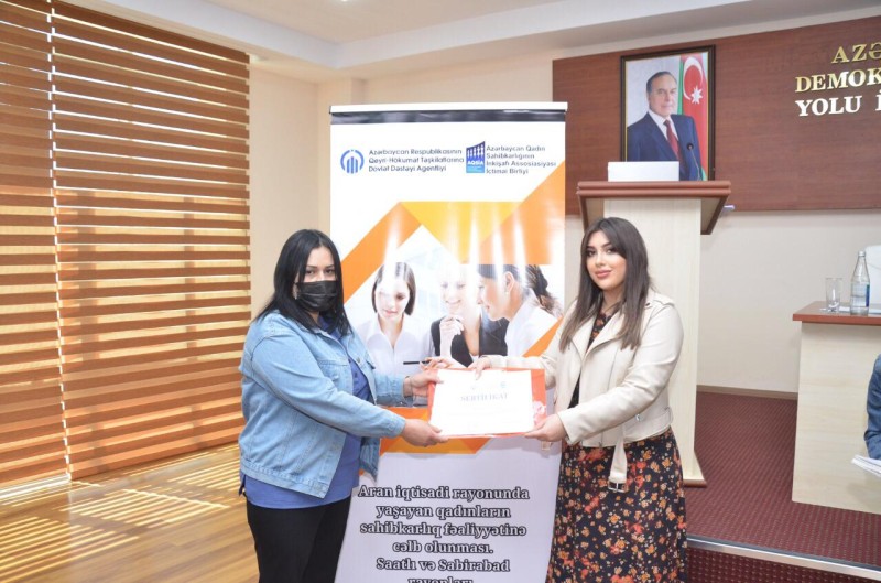 Azərbaycan Respublikasının Qeyri-Hökumət Təşkilatlarına Dövlət Dəstəyi Agentliyinin maliyyədəstəyilə “Azərbaycanda Qadın Sahibkarlığının İnkişafı Assosiasiyası” İctimai Birliyi “Araniqtisadi rayonunda yaşayan qadınların sahibkarlıq fəaliyyətinə cəlb olunması” adlı layihəsi çərçivəsində 14-15 aprel, 2022-ci il tarixlərində Saatlı və Sabirabad rayonlarında qadınlara “Qadın sahibkarlığı və Biznesə Başla təlimləri keçirilib.
