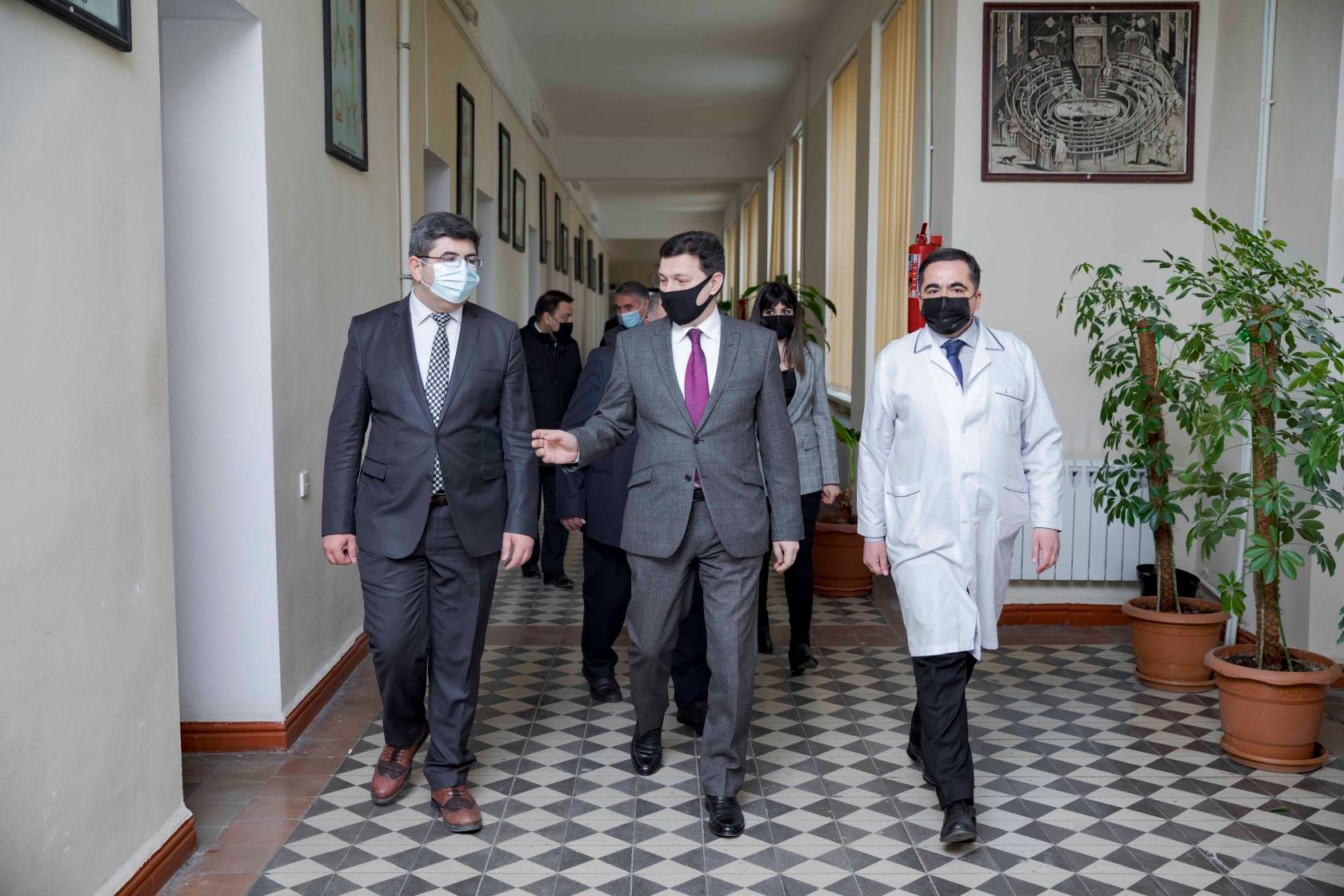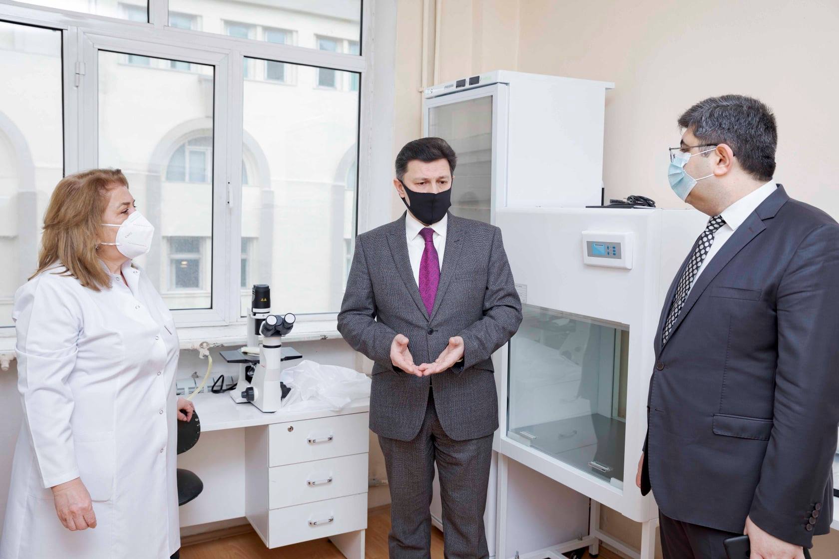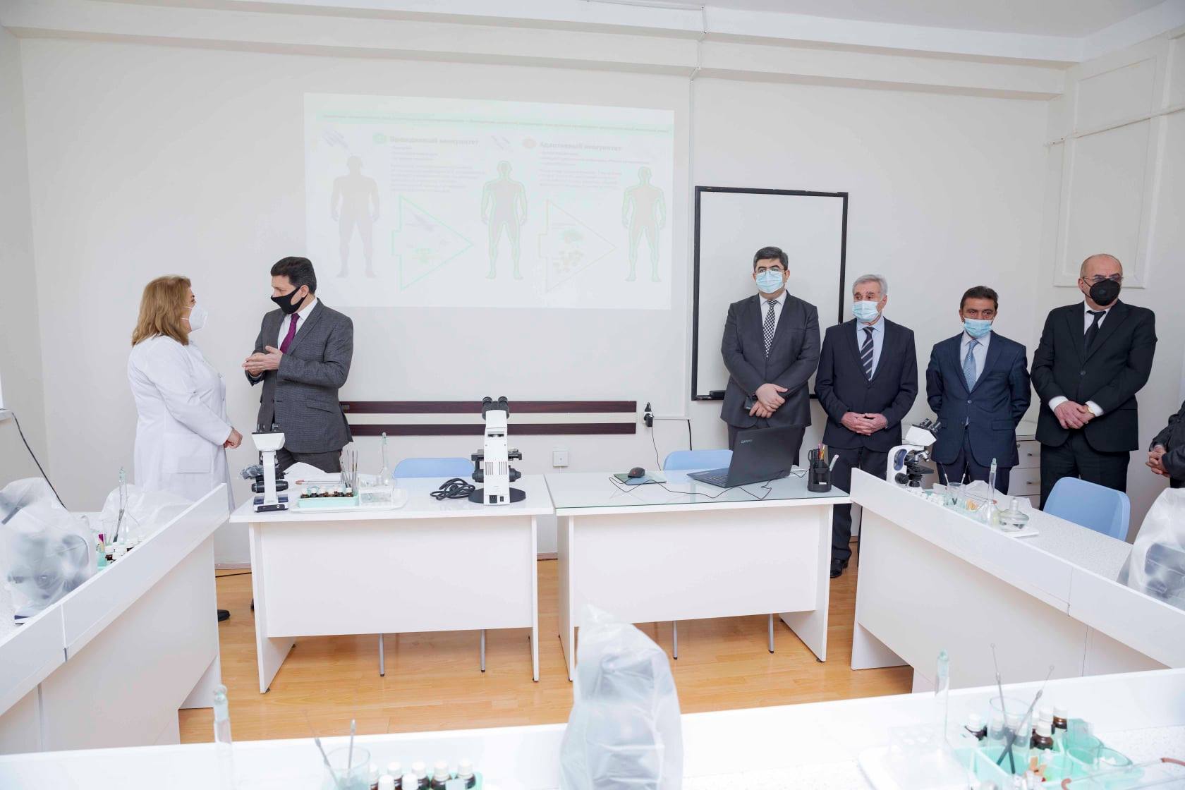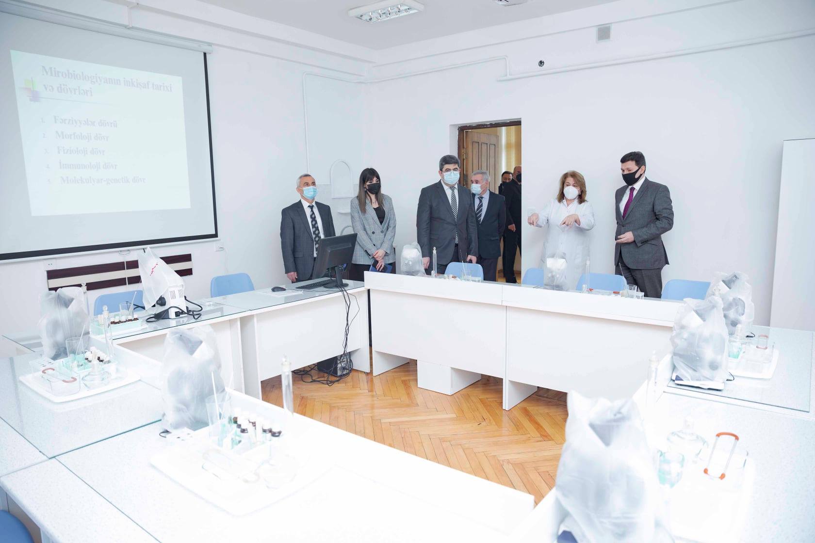 ATU rektoru, professor Gəray Gəraybəyli həmçinin Tibbi mikrobiologiya və immunologiya kafedrasının tədris və elmi laboratoriyaları üçün alınmış avadanlıqlarla da tanış olub. Qeyd olunub ki, kafedrada 2 tədris otağı müasir tələblərə və infeksion nəzarət qaydalarına cavab verən tərzdə qurulub. Bu tədris otaqlarında hər bir tələbə xüsusi quruluşlu laborator masalarında lazımi ləvazimatlarla təchiz edilmiş fərdi iş yeri ilə təmin olunur. İş yerində mikroskop, spirt lampası, bakterioloji ilgəklər, sınaq və əşya şüşələri, rəngləmə dəsti, mikrob kulturası və s. var. Bundan əlavə, həmin otaqlarda praktik işin təqdimatını keçirmək, animasiya və ya tədris filmi vasitəsi ilə nümayiş etdirmək üçün kompüter və proyektor da quraşdırılıb. Daha 3 otaqda tələbələr üçün individual iş yerləri yaradılıb və zəruri ləvazimatlarla təchiz edilmişdir. Kafedranın nəzdindəki digər 11 tədris otağı isə bu cür iş masaları ilə qismən təchiz edilib.