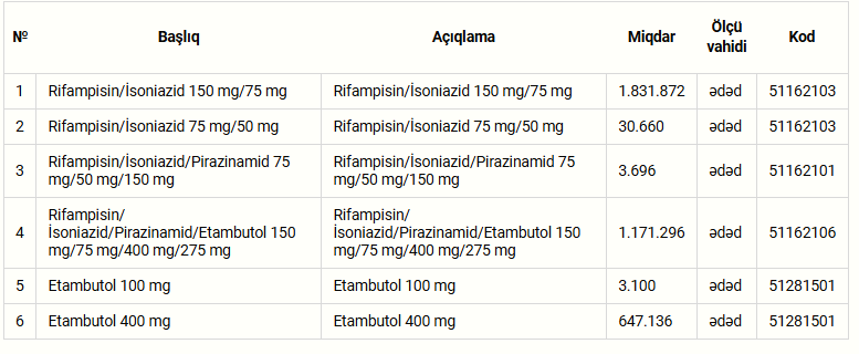 Beləliklə, vərəmlə mübarizə üzrə Tədbirlər Proqramına əsasən, ölkəyə gətiriləcək dərman vasitələrinin siyahısını təqdim edirik:
