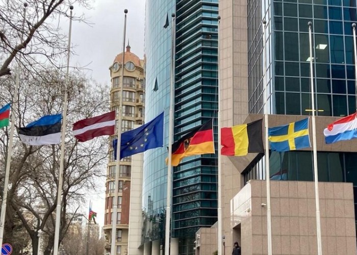 Bakıda Avropa səfirliklərinin bayraqları yarıya endirilib.
