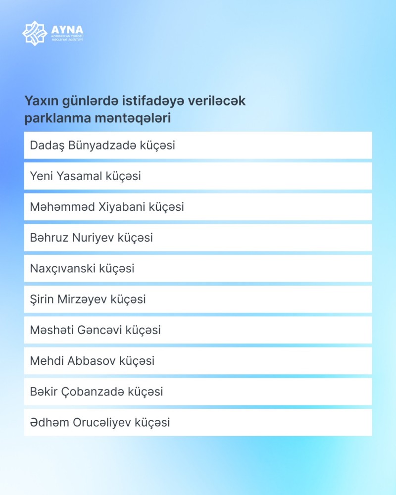 Yaxın günlərdə Dadaş Bünyadzadə, Yeni Yasamal, Məhəmməd Xiyabani, Bəhruz Nuriyev, Naxçıvanski, Şirin Mirzəyev, Məshəti Gəncəvi, Mehdi Abbasov, Bəkir Çobanzadə və Ədhəm Orucəliyev küçələrində parklanma yerləri istifadəyə veriləcək. Nişanlanma xətlərinin çəkildiyi küçələrdə müvafiq yol nişanları quraşdırılacaq və yeni məntəqələr nəqliyyat vasitələri sahiblərinin ixtiyarında olacaq.