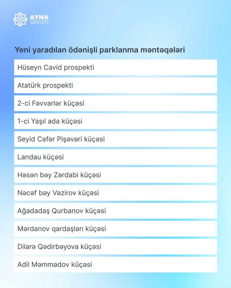 Adalet.az xəbər verir ki,Hüseyn Cavid və Atatürk prospektlərində, 2-ci Fəvvarlər, 1-ci Yaşıl ada, Seyid Cəfər Pişəvəri, Landau, Həsən bəy Zərdabi, Nəcəf bəy Vəzirov, Ağadadaş Qurbanov, Mərdanov qardaşları, Dilarə Qədirbəyova və Adil Məmmədov küçələrində ödənişli parklanma məntəqələri yaradılaraq sürücülərin istifadəsinə verilib. Parklanma yerləri təşkil edilən zaman fiziki imkanları məhdud sürücülərin avtomobilləri üçün müvafiq şərait yaradılır.