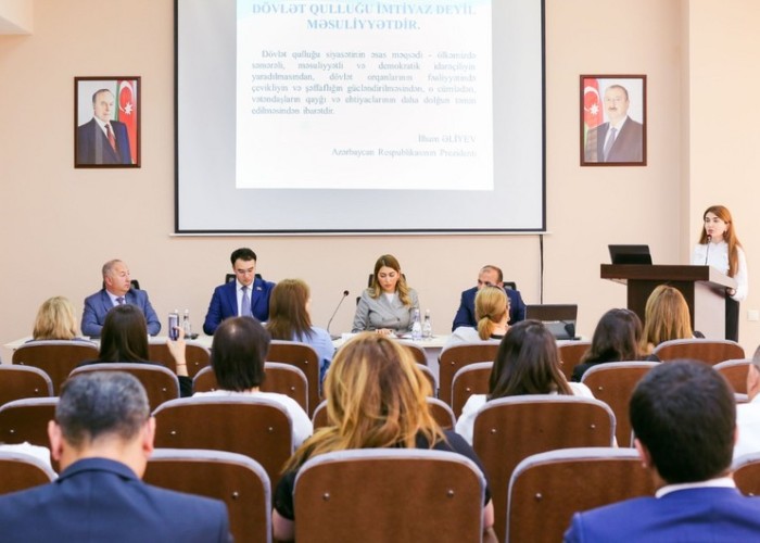 Konfrans zamanı Mətbuat Xidmətinin məsləhətçisi Aynurə Əliyeva “Dövlət qulluqçusunun məsuliyyəti”, həmçinin Hüquqi təminat və insan hüquqları məsələləri idarəsinin baş məsləhətçisi Şahxanım Ağayeva “Müasir dövrdə dövlət qulluqçularının xidməti fəaliyyətinin yüksəldilməsi”, Elm-Tədris Mərkəzinin baş məsləhətçisi İlkanə Qasımova “Dövlət qulluğunda institusional islahatların həyata keçirilməsi”, Beynəlxalq hüquqi əməkdaşlıq idarəsinin baş məsləhətçisi Aydan Nurəlizadə “Dövlət qulluğunun inkişaf prinsipləri”, Maddi-texniki təminat şöbəsinin aparıcı məsləhətçisi Ay Sənəm Müslümova “Dövlət qulluğuna qəbul edilmək hüququ və qulluğa qəbul” və Dövlət təhlükəsizliyi, fövqəladə hallar və sərhəd xidməti orqanlarının istintaq, təhqiqat və əməliyyat-axtarış fəaliyyətində qanunların icrasına nəzarət idarəsinin baş məsləhətçisi Yaqut Şövkətova “Dövlət qulluqçuların sosial təminatın yüksəldilməsi” mövzularında çıxışlar edib.