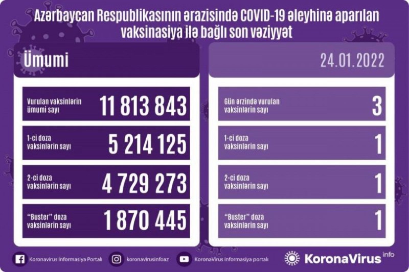 Ölkədə vurulan vaksinlərin ümumi sayı 11 813 843, birinci mərhələ üzrə vaksinasiya olunanların ümumi sayı 5 214 125, ikinci mərhələ üzrə vaksinasiya olunanların sayı 4 729 273, buster doza üzrə vaksinasiya olunanların sayı isə 1 870 445 təşkil edir.