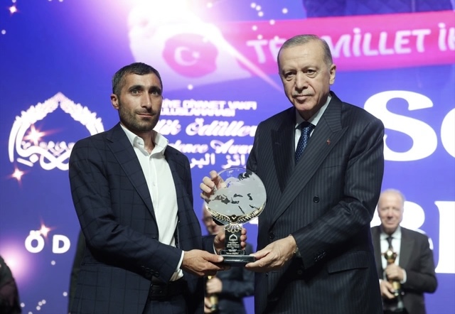 “Cənab Prezidentimiz Rəcəb Tayyib Ərdoğan “Yurt Dışı Vefa Ödülü”nə layiq görülən, Türkiyənin yaşadığı “əsrin fəlakəti”ndən dərhal sonra maşınına yüklədiyi yardımla Azərbaycanın paytaxtı Bakıdan yola düşən Sərvər Bəşirliyə mükafatını təqdim etdi”, - paylaşımda qeyd olunub.