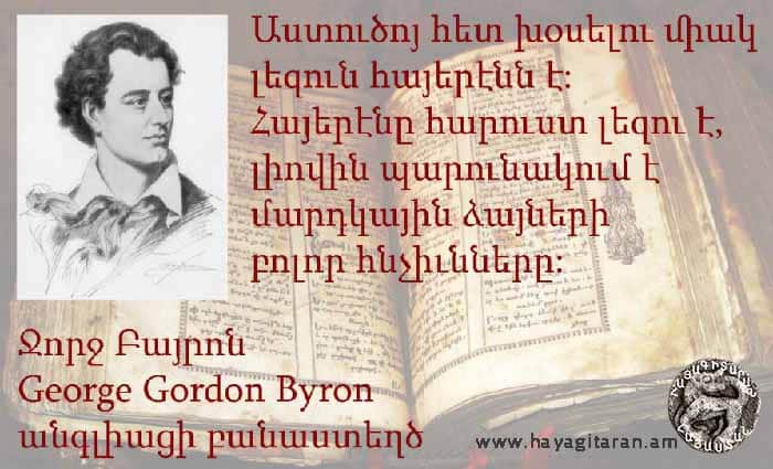 Hətta guya Bayron 1816-cı ildə yazırmış ki, mən bacardığım qədər mənimsədiyim erməni dilini öyrənməyə başlamışam və öyrənməyə də davam edirəm:” Hər gün bir erməni monastırına gedirəm ki, alim bir rahibdən dərs alıram və bu barədə artıq unikal və faydalı məlumatlar əldə etmişəm. o şərq xalqının ədəbiyyatı və adət-ənənələri. Onların burada bir qurumu var: kilsə və doxsan rahibdən ibarət bir yığıncaq. Onların bəziləri çox alim və savadlı insanlardır. Onların həm də mətbəəsi var və öz millətlərini maarifləndirmək üçün böyük səylər göstərirlər " .