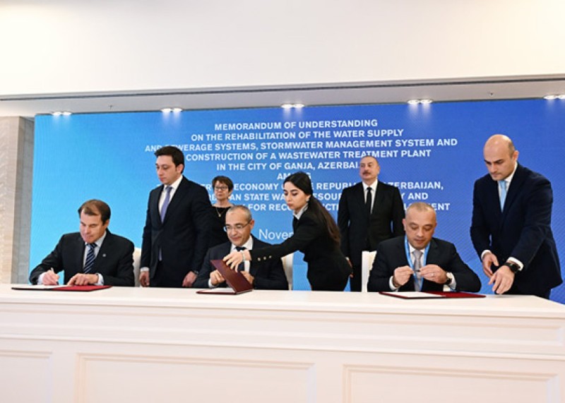 Adalet.az-ın məlumatına görə, görüşdə tərəflərin iştirakı ilə “Gəncə şəhərində su təchizatı və kanalizasiya sistemlərinin, yağış sularının idarəetmə sisteminin yenidən qurulması və tullantı sularının təmizlənməsi qurğusunun tikintisi üzrə Azərbaycan Respublikasının İqtisadiyyat Nazirliyi, Azərbaycan Dövlət Su Ehtiyatları Agentliyi və Avropa Yenidənqurma və İnkişaf Bankı arasında Anlaşma Memorandumu”nun imzalanması mərasimi olub.