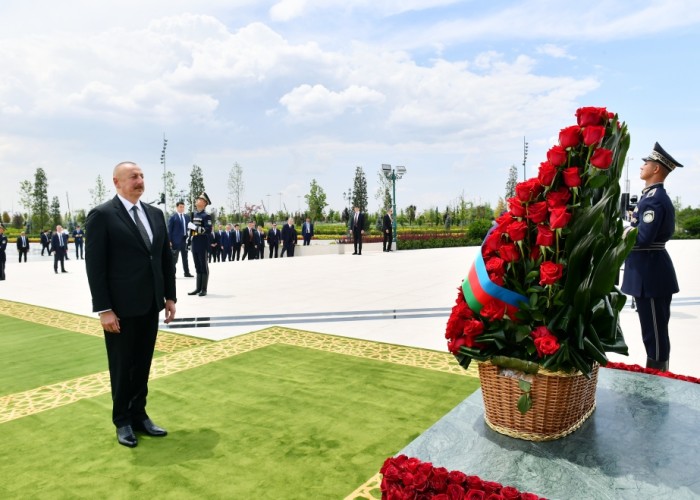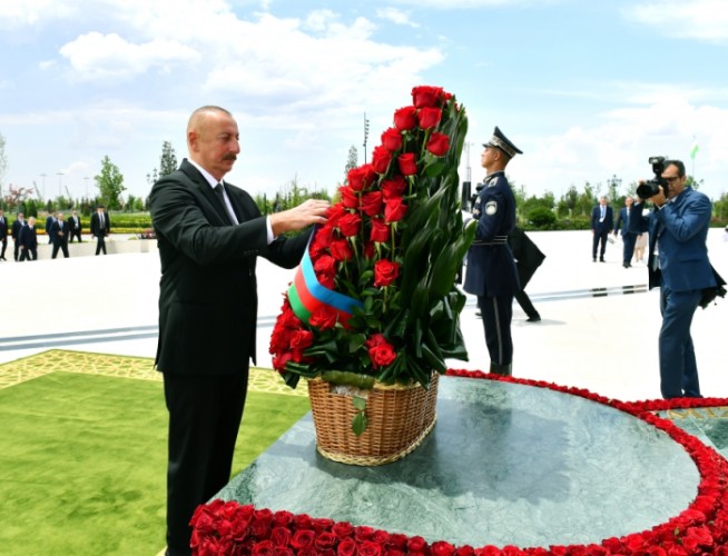 Adalet.az xəbər verir ki, Prezident İlham Əliyev abidənin önünə əklil qoyub.