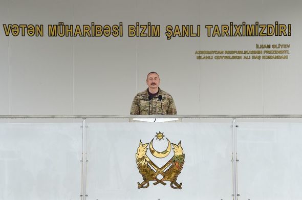 Müharibədən sonra bu gün Azərbaycan Ordusu daha güclüdür - həm təchizat nöqteyi-nəzərdən, həm də döyüş qabiliyyəti nöqteyi-nəzərdən. Ona görə biz bundan sonra da Ordumuzun inkişafı üçün ciddi addımlar atacağıq. Ən müasir silahları almaq üçün yeni kontraktlar imzalandı. Bu kontraktlar artıq icra olunur, yeni silahlar, ən müasir texnika Azərbaycana gətirilir və gətiriləcək. Ermənistanla sərhəddə bizim mövqelərimiz daha da möhkəmlənəcək. Əgər Ermənistan sərhədlərin müəyyən edilməsi işində yenə də öz köhnə taktikasına qapılsa, vaxt uzatmağa çalışsa, nəticədə özü peşman olacaq. Biz Ermənistanda baş qaldıran revanşist qüvvələrin hərəkətlərinə diqqətlə baxırıq. Onlar da bunu bilsinlər. Bax, o dağın başında mənim sözlərim yazılıb: “Dəmir yumruq” yerindədir, bunu heç kim unutmasın”.