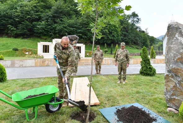 Sonra Prezident İlham Əliyev hərbi şəhərciyin ərazisində uzunömürlülük rəmzi kimi çinar ağacı əkib, şəhidlərin xatirəsinə ucaldılan abidə-kompleksini və “Dəmir yumruq” abidəsini ziyarət edib.