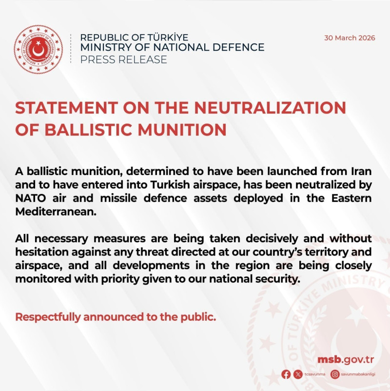 "İrandan atıldığı müəyyən edilən və Türkiyə hava məkanına daxil olan bir ballistik sursat Şərqi Aralıq dənizində yerləşdirilmiş NATO hava və raket müdafiəsi elementləri tərəfindən zərərsizləşdirilib", - məlumatda bildirilib.