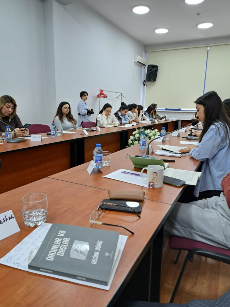 Regina Bakıda nəşr edilən romanının ilk tərcüməolduğunu deyib, əsərin hansı zərurətdən yaranmasından danışıb. Qısa müddətdə çox səmimi ortam yaradan qonaq tələbələrdən romandan parçalar oxunmasını xahiş edib, əsərin dilimizdə necə səsləndiyini dinləmək istəyib, onları maraqlandıran suallara cavab verib. Onun təklifi ilə görüş iştirakçılarıtərəfindən daş, yaddaş, “kitab olsam hansı məzmunda olmaq istəyərdim?” mövzularında mətnlər yazılıb, oxunulub.