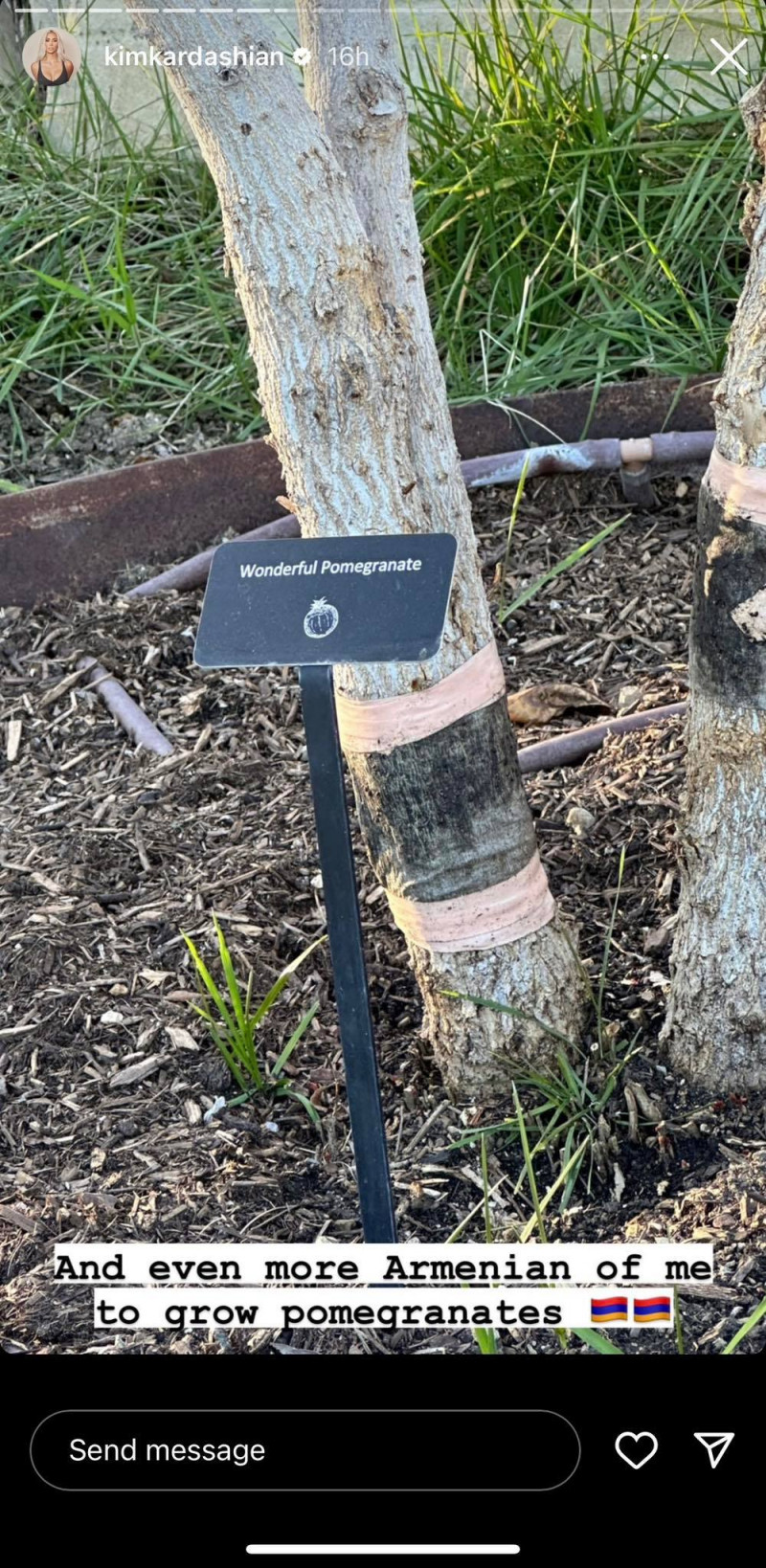 Adalet.az xəbər verir ki, erməni mənşəli amerikalı porno-ulduz Kim Kardaşyan erməni lduğunu sərgiləmək üçün “qədim erməni əriyi ilə bağlı paylaşım edib. O, öz İnstaqram səhifəsində 60 milyon dollarlıq malikanəsinin bağını və ərik və nar ağaclarının tinglərini nümayiş etdirib.