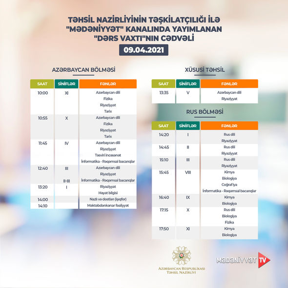 “Mədəniyyət” və “ARB Günəş” telekanallarında yayımlanan “Dərs vaxtı” proqramının aprelin 9-na nəzərdə tutulan cədvəli açıqlanıb.