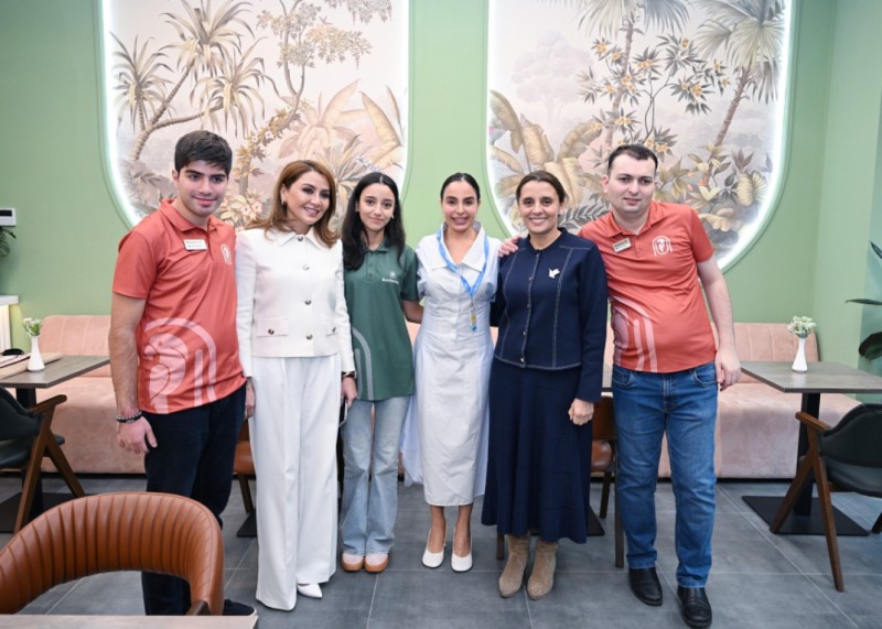 Leyla Əliyeva kafedə yaradılmış şərait və iş mühiti ilə tanış olub, burada məşğulluğu təmin edilmiş əlilliyi olan gənclərlə görüşərək onlarla söhbət edib.