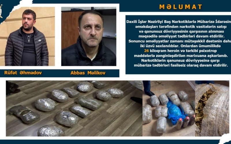 Onlardan ümumilikdə 26 kiloqram heroin və tərkibi psixotrop maddələrlə zənginləşdirilən marixuana aşkarlanıb. Saxlanılan şəxslər narkotik vasitələri şəxsiyyəti istintaqla araşdırılan İran vətəndaşları vasitəsilə Biləsuvar rayonu, eləcə də paytaxt ərazisində müxtəlif ünvanlardan, əvvəlcədən müəyyənləşdirilmiş yerlərdən götürərək maddi qazanc müqabilində ayrı-ayrı şəxslərə çatdırmağı planlaşdırıblar. Saxlanılanların hər biri ölkədə narkotik vasitələrin əsas tədarükçülərindən olublar.