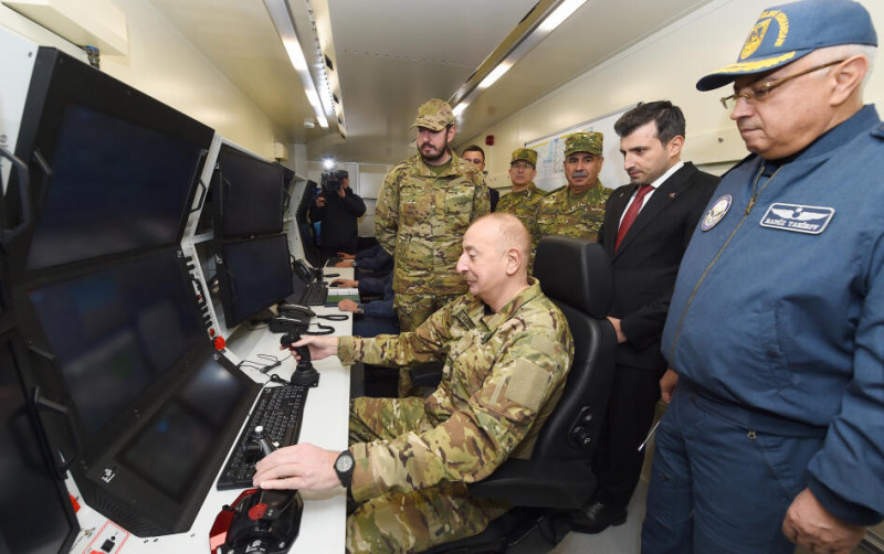 "Akıncı" hücum PUA-sının havaya qalxmasını izlədikdən sonra idarəetmə məntəqəsinə gələn Prezident İlham Əliyev burada PUA-nın idarəolunmasını praktiki həyata keçirib.