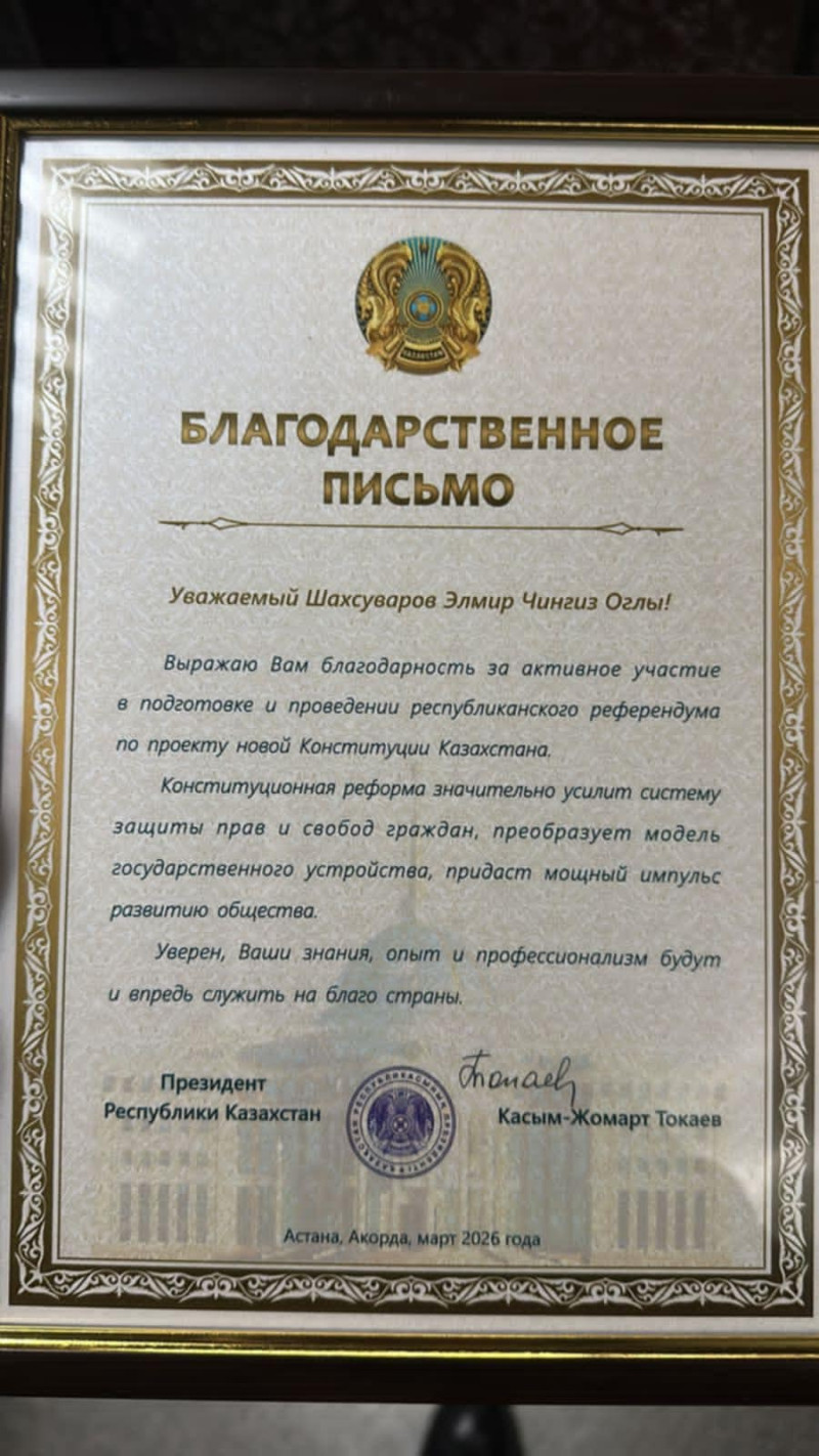 Qazaxıstan prezidenti Kasım-Jomart Tokayev azərbaycanlı ictimai fəal Qazaxıstanın yeni Konstitusiya layihəsi üzrə ümumxalq referendumunun hazırlanmasında və keçirilməsində fəal iştirakına görə təşəkkür məktubu göndərib.
