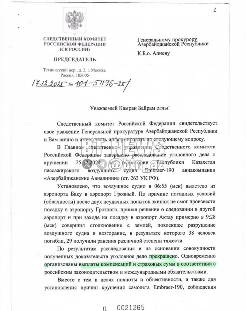 Onun məzmununa görə, sənəd Rusiya Federasiyasının İstintaq Komitəsindən götürülüb və Azərbaycanın Baş Prokurorluğuna ünvanlanıb. İddia olunur ki, AZAL-a məxsus təyyarə Rusiyada əlverişsiz hava şəraiti səbəbindən yerə enə bilməyib, daha sonra eniş zamanı yerə çırpılıb. Bu əsasda cinayət işinə xitam verilib.