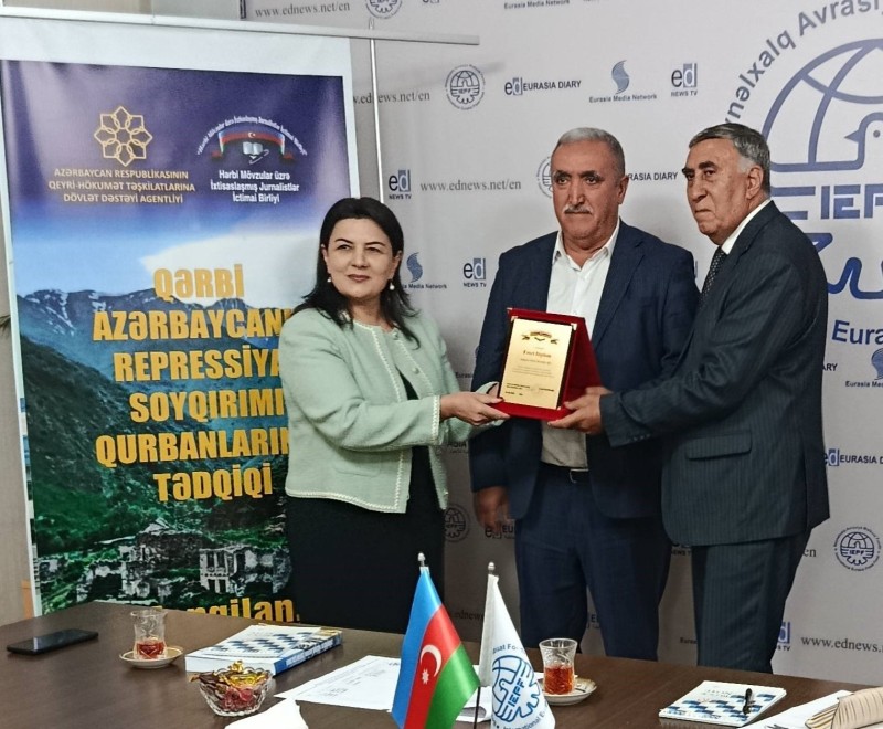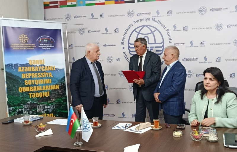 "Hərbi Mövzular üzrə İxtisaslaşmış Jurnalistlər" İctimai Birliyinin "Qərbi Azərbaycanlı repressiya və soyqırım qurbanlarının tədqiqi" layihəsinin icrası başa şatıb. Layihəyə Beynəlxalq Avrasiya Mətbuat Fondunun (BAMF) iclas zalında mətbuat və ictimaiyyət nümayəndələrinin iştirakı ilə yekun vurulub. Tədbirdə əvvəlcə dövlətimizin müstəqilliyi, ərazi bütövlüyü uğrunda Şəhid olanların və repressiya, soyqırımı, deportasiya qurbanlarının xatirəsi ehtiramla yad edilib. Layihə rəhbəri Tamxil Ziyəddinoğlu Qeyri- Hökumət Təşkilatlarına Dövlət Dəstəyi Agentliyinə layihənin dəstəklənməsinə görə, Beynəlxalq Avrasiya Mətbuat Fondunun qurucu sədri Umud Rəhimoğluna isə layihənin icrasına yaratdığı şəraitə görə minnətdarlığını bildirib. Tədbirə qatılanlarla ümumi tanışlıqdan sonra Umud müəllim qonaqları salamlayıb, xoş gəldiniz deyib. Belə mühüm layihələrin vacibliyini qeyd edərək, Qərbi Azərbaycanda ermənilərin torpaqlarımıza hakim olmaları, soydaşlarımıza qarşı aparılan amansız soyqırımı haqqında danışıb. Yaratdığı təşkilatın bu illər ərzində gördüyü işlərdən söhbət açıb.