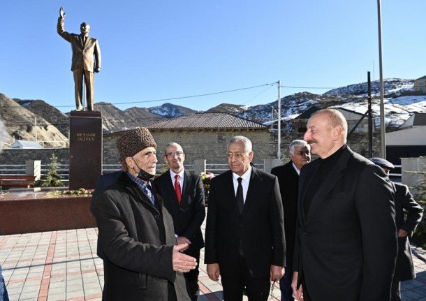 Prezidenti İlham Əliyev, birinci xanım Mehriban Əliyeva və qızları Leyla Əliyeva Qonaqkənd sakinləri ilə birlikdə ulu öndər Heydər Əliyevin qəsəbənin mərkəzində ucaldılan abidəsinin önünə gül dəstəsi qoyublar.