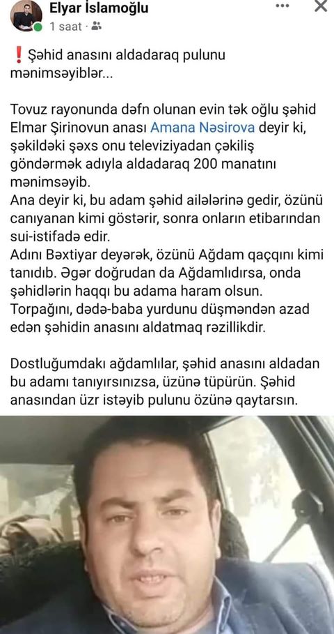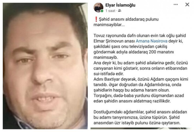 Şəhid mayor Vüsal Vəliyevin qardaşı Elyar İslamoğlunun sosial şəbəkə paylaşımı izləyicilərdə şok effekti yaradıb. O, adının Bəxtiyar olduğunu deyən və özünü Ağdam köçkünü kimi təqdim edən şəxsin Tovuz rayonunda şəhid Elmar Şirinovun anası Amana Nəsirovaya kələk gəldiyini yazıb. Beləki, İslamoğlu Bəxtiyarın ananı oğlu barədə televiziyada çəkiliş etmək adıyla aldadaraq, 200 manat aldığı haqda məlumatı yayınlayıb.