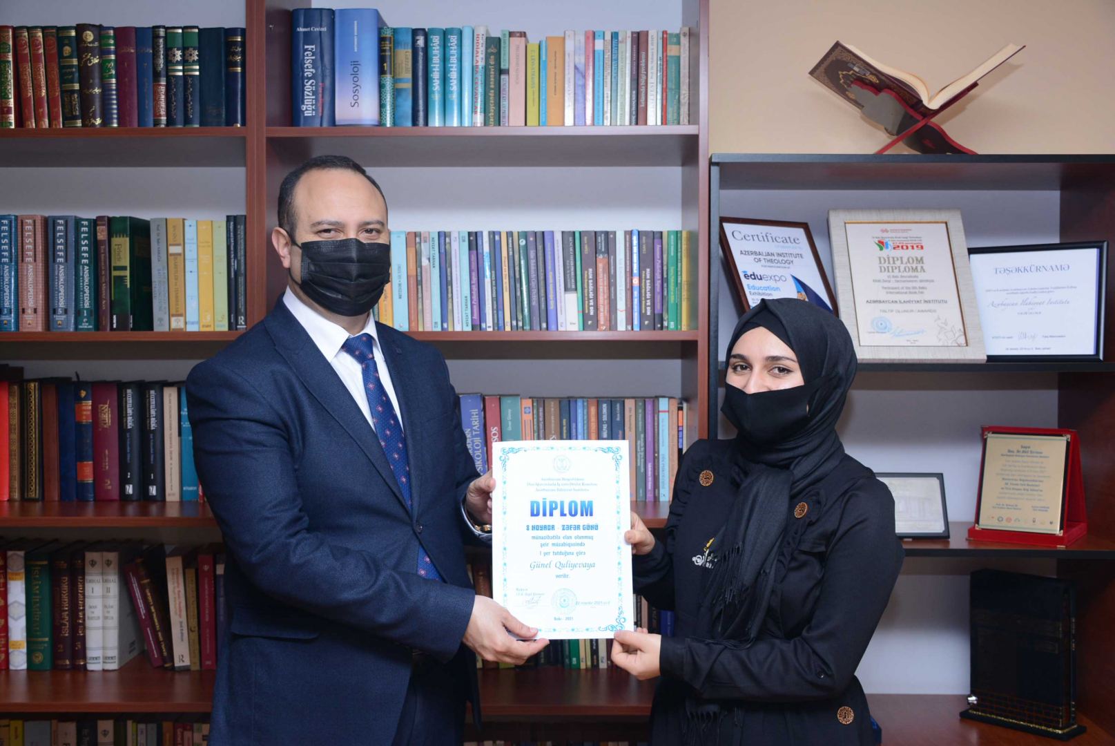 Aİİ rektoru, dosent Aqil Şirinov qaliblərlə görüşüb, onlara diplomlarını təqdim. Bildirib ki, müsabiqənin keçirilməsində məqsəd 44 günlük Vətən müharibəsində Şanlı Qələbəmizin canlı şahidi olan gənclərə milli-mənəvi dəyərlərimizin aşılanması, onlarda vətənpərvərlik, dövlətçilik, Vətənə sevgi hisslərinin daha da gücləndirilməsidir.