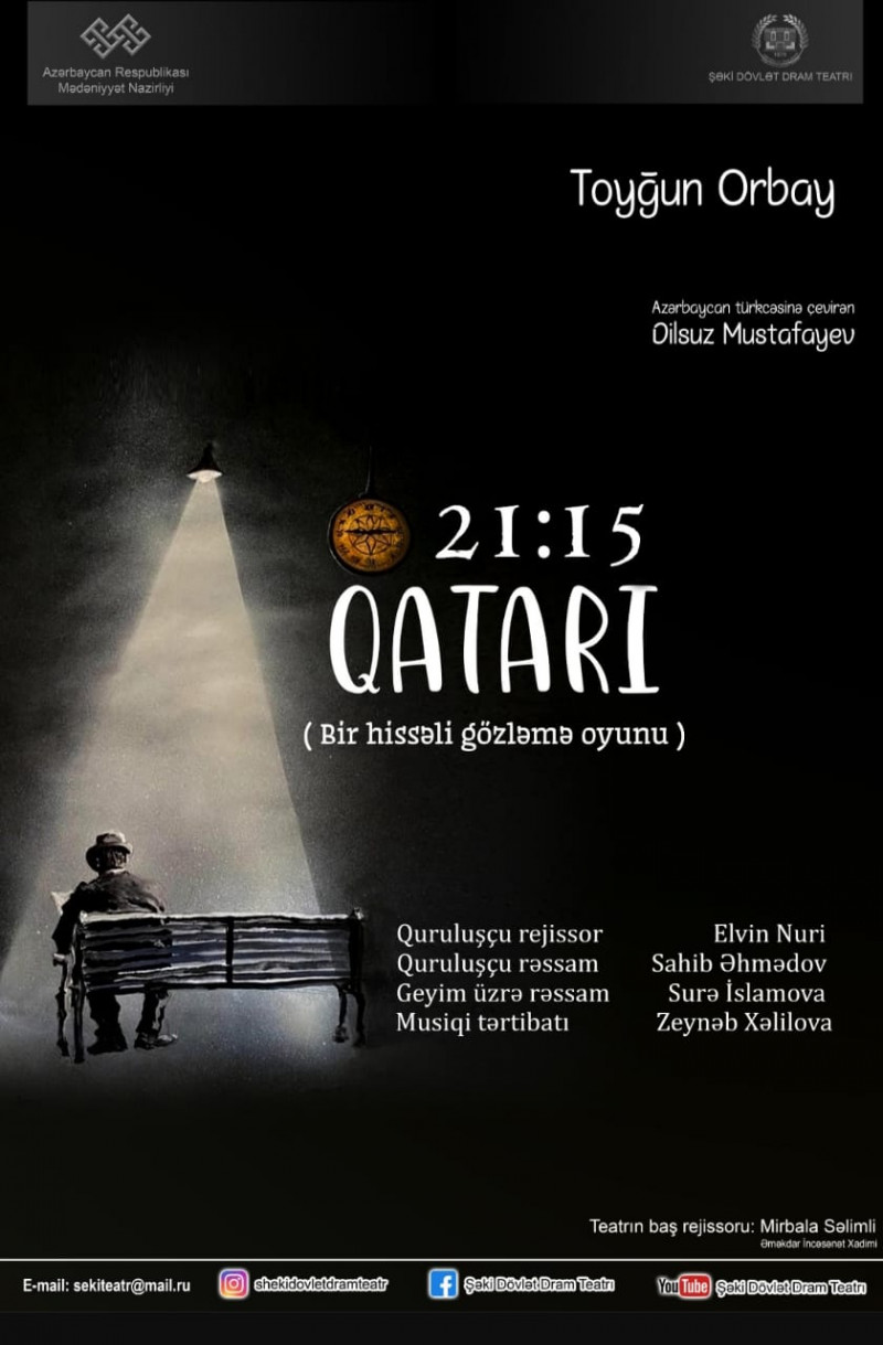 Azərbaycan Respublikasının Mədəniyyət Nazirliyi və Azərbaycan Teatr Xadimləri İttifaqının təşkilatçılığı ilə "QONAQ TEATR" layihəsi çərçivəsində Şəki Dövlət Dram Teatrının "21.15 QATARI" (Toyğun Orbay) tamaşası təqdim olunacaq.