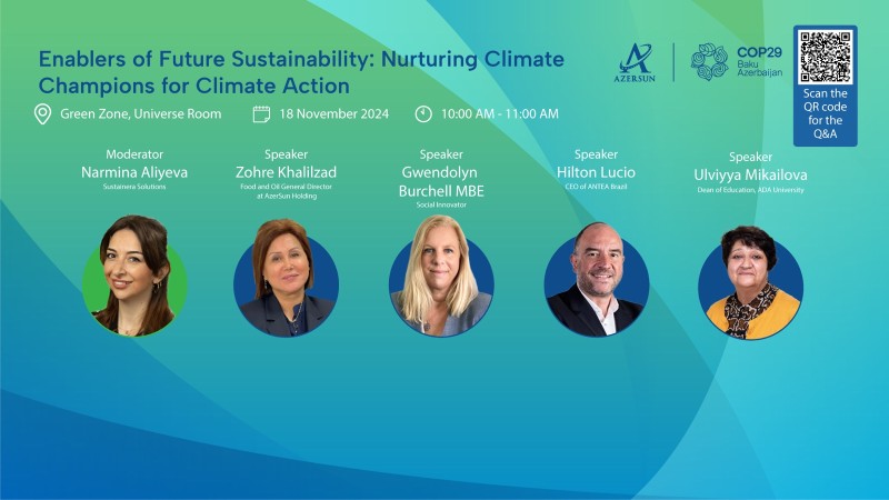 Növbəti tədbir 18 noyabr saat 10:00-11:00 arası Yaşıl Zona Kainat zalında “Gələcək Dayanıqlılığının Təminatçıları: İqlim Fəaliyyəti Üçün İqlim Çempionlarının Yetişdirilməsi” adlı panel müzakirəsi keçiriləcək. Tədbirin çıxışçılarından biri də “Azərsun Holdinq”in Yağ və Sous katerqoriyasının baş direktoru Zöhrə Xəlilzaddır. Panel müzakirəsində iqlim dəyişikliyi ilə mübarizə, davamlı inkişaf və bu sahədə fəaliyyət göstərən gənc liderlərin rolunun artırılması mövzuları müzakirə olunacaq.