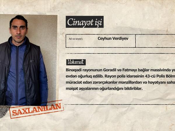 Qeyd olunub ki, Binəqədi rayonunun Goradil və Fatmayı bağlar massivində yerləşən yeddi evdən oğurluq edilib. Rayon polis idarəsinin 43-cü Polis Bölməsinə müraciət edən zərərçəkənlər mənzillərdən və həyətyanı sahələrdən məişət əşyalarının oğurlandığını bildiriblər.