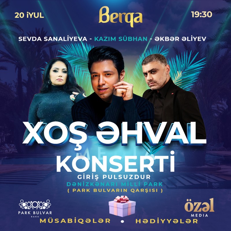 “Berqa” bu həftəsonunu da sizinlə birlikdə xoş əhval keçirəcək. Dənizkənarı Milli Parkda “Park Bulvar”ın qarşısında silsilə konset proqramıları davam edir. Növbəti konsert proqramı 20 və 21 iyul tarixində saat 19:30-da baş tutacaq.
