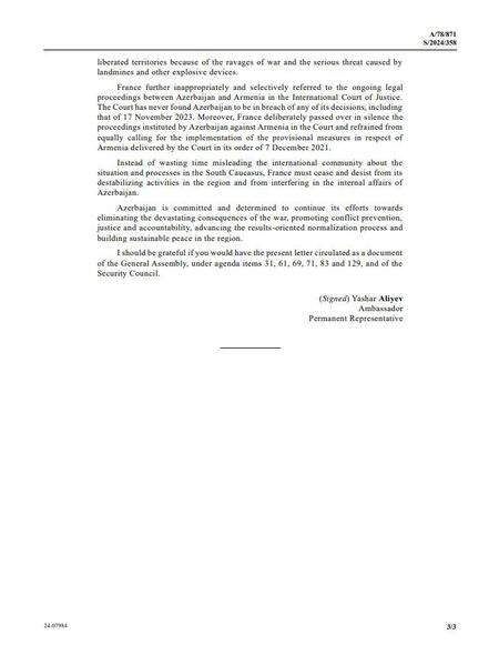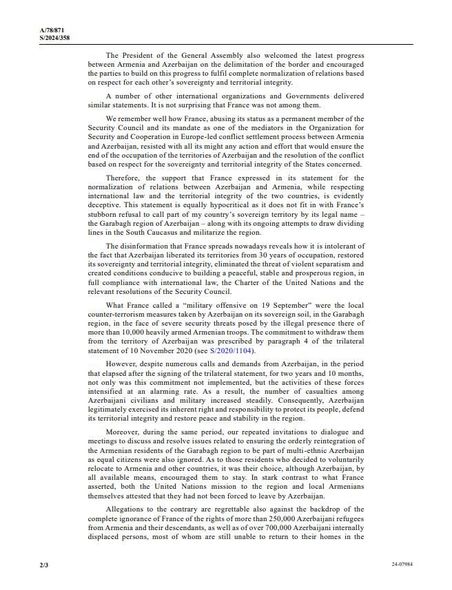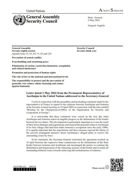 Məktubda qeyd olunub ki, Fransa nümayəndəyə heyəti BMT Təhlükəsizlik Şurasının 19 aprel 2024-cü il tarixli iclasında Azərbaycan və Ermənistan arasındakı münasibətlərlə bağlı əsassız və yanlış fikirlər səsləndirib.