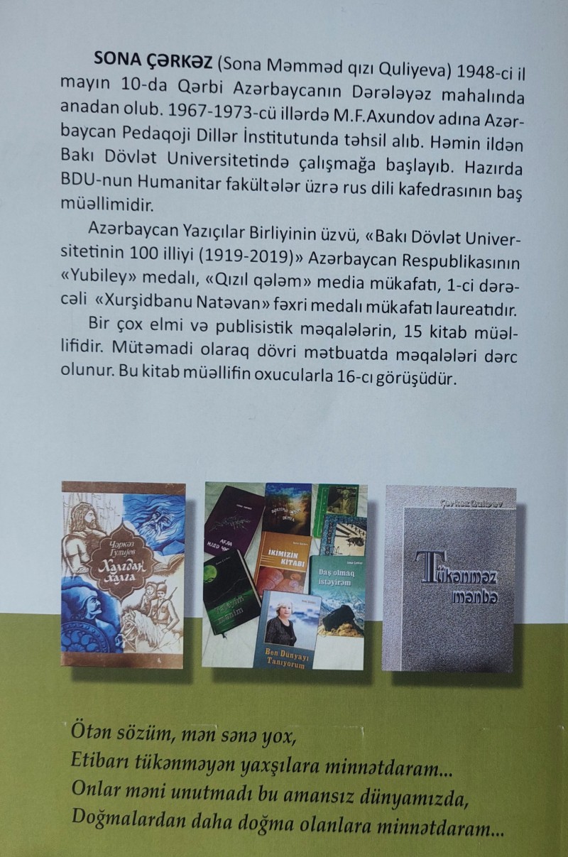 Mənim üçün şərəfdir ki, kitabda «Sözlə sirdaş olan Sona Çərkəz» adlı yazım da yer alıbdır. Buna görə kitabın məsləhətçisinə və redaktorlarına təbii ki, həm də Sona xanıma təşəkkürümü bildirirəm. Və indiki məqamda son olaraq vurğulamaq istəyirəm ki, Sona xanım, siz yəqin ki, «Sənsiz» deyəndə, yazanda sənsiz, yəni Çərkəz müəllimsiz olmadığınız qənaətini yaddan çıxarmırsınız, çünki siz onsuz deyilsiz!