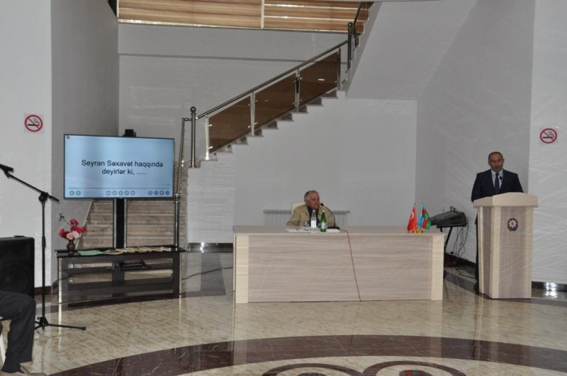 Faiq Xudanlı Seyran Səxavətin yaradıcılığı və şəxsiyyəti haqqında geniş bir məruzə edir. Sonra da yazıçıya Mədəniyyət İdarəsinin adından bir xatirə bağışlayır. Xatirə də rəssam tərəfindən çəkilmiş Qarabağın gözəl bir mənzərəsidir.