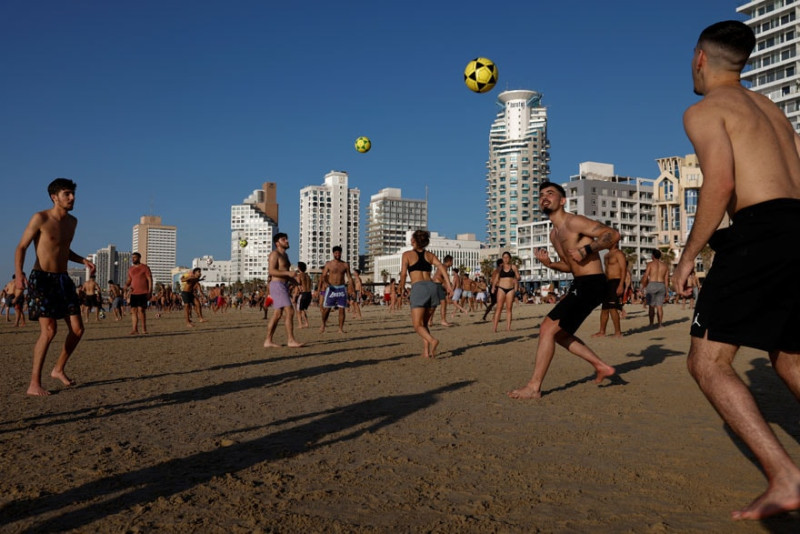 Havalar yaxşılaşdıqca müharibəyə əhəmiyyət verməyən bir çox israilli Tel-Əviv sahilinə axışaraq dənizin, qumun və günəşin ləzzətini çıxarıb. Bəzi israillilər çimərlikdə uzanıb dincələrkən, digərləri dostları ilə top oynayıblar.