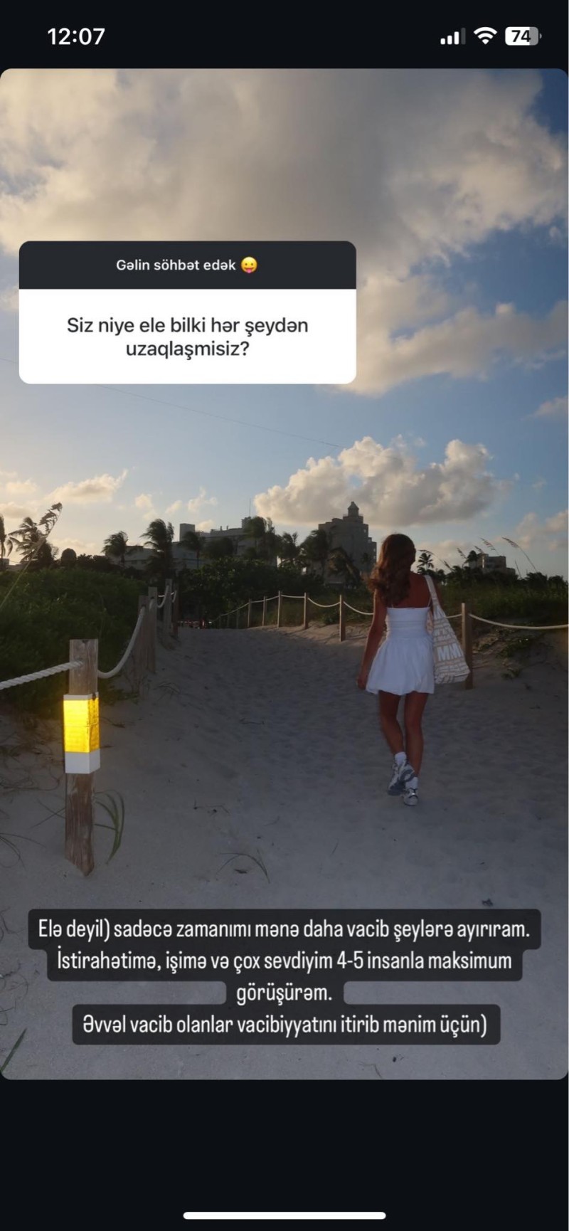 İnstagramda “sual- cavab” bölməsində ona ünvanlanan “Siz niyə elə bilk i, hər şeydən uzaqlaşmısnız” sualına, “Elə deyil. Zamanımı mənim üçün daha vacib olan şeylərə ayırıram.İstirahətimə, işimə və çox sevdiyim 4-5 insanla maksimum görüşürəm. Əvvəl vacib olanlar indi vacibiyyatını itirib mənim üçün” cavabını verib.
