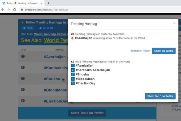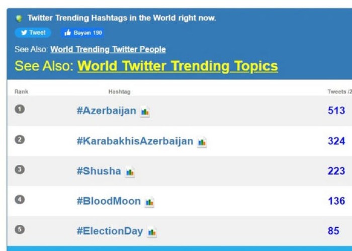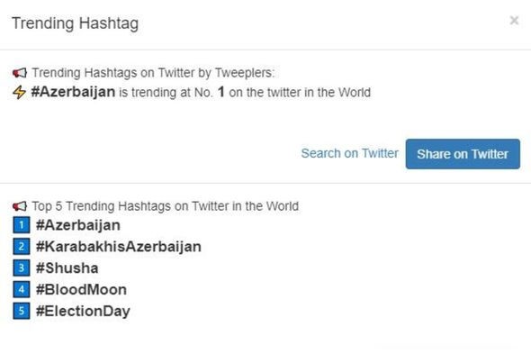 8 noyabr Zəfər Günü ilə əlaqədar çoxsaylı paylaşımlara görə #Azerbaijan həştəqi "Twitter"in dünya trendində 1-ci yerə yüksəlib.