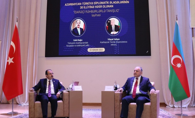 “İdarəçi rəhbərlərlə tanışlıq” layihəsi çərçivəsində təşkil olunan görüşdə AzTU-nun rektoru Vilayət Vəliyev Azərbaycan və Türkiyə diplomatik münasibətlərinin qurulmasının 30 illiyi münasibətilə təbriklərini çatdırıb. Azərbaycan və Türkiyə münasibətlərinin qardaşlıq və həmrəylik nümunəsi olduğunu bildirən rektor bu birliyin möhkəm təməllər üzərində qurulduğunu diqqətə çatdırıb. Hazırda qardaş ölkələr arasında münasibətlər xalqımızın ümummilli lideri Heydər Əliyevin “Bir millət, iki dövlət” və Türkiyə Cümhuriyyətinin banisi Mustafa Kamal Atatürkün “Azərbaycanın sevinci bizim sevincimiz, kədəri bizim kədərimizdir” kəlamlarına uyğun inkişaf edir. Rektor qeyd edib ki, iki qardaş ölkə arasında əlaqələrin bugünkü səviyyədə inkişaf etməsində Azərbaycan Prezidenti İlham Əliyev və Türkiyə Prezidenti Rəcəb Tayyib Ərdoğanın qardaşlıq münasibətləri də mühüm rol oynayır. 44 günlük Vətən müharibəsində Türkiyənin Azərbaycana mənəvi və siyasi dəstəyi bu münasibətlərin daha bir nümunəsi idi.
