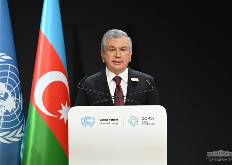 Özbəkistan Prezidenti Şavkat Mirziyoyev noyabrın 12-də Bakıda keçirilən BMT-nin İqlim Dəyişikliyi Konvensiyasının (COP29) Tərəflər Konfransının 29-cu sessiyası çərçivəsində Dünya Liderlərinin Zirvə görüşündə çıxış edib.