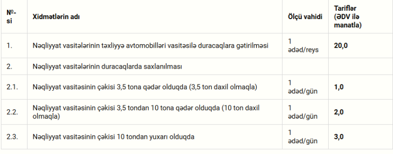 Qeyd edək ki, Tarif Şurasının 12 aprel 2006-cı il tarixli Qərarına əsasən, Daxili İşlər Nazirliyinin Baş Dövlət Yol Polisi İdarəsinin nəzdində fəaliyyət göstərən duracaqlara nəqliyyat vasitələrinin təxliyə avtomobilləri vasitəsilə gətirilməsi və orada mühafizə olunaraq saxlanılması xidmətlərinin aşağıda göstərilən tarifləri təsdiq edilib: