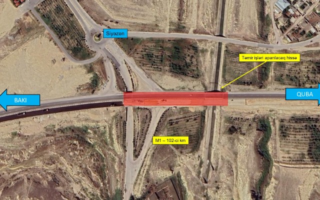 "M-1 Bakı-Quba-Rusiya Federasiyası ilə dövlət sərhədi avtomobil yolunun 102-ci kilometrində yolötürücüdə və kanal üzərində yerləşən körpüdə aparılacaq təmir işləri ilə əlaqədar olaraq, avtomobil yolunun qeyd edilən hissəsində 08 mart 2025-ci il saat 10:00-dan etibarən nəqliyyat vasitələrinin hərəkəti qismən məhdudlaşdırılacaq".