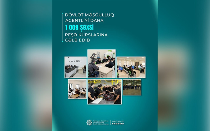 Əmək və Əhalinin Sosial Müdafiəsi Nazirliyinin tabeliyində Dövlət Məşğulluq Agentliyi tərəfindən daha 1009 nəfər işsiz və işaxtaran şəxs əmək bazarının tələblərinə uyğun peşələr üzrə hazırlıq kurslarına cəlb edilib.