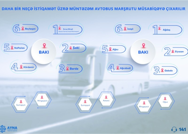 Azərbaycan Yerüstü Nəqliyyat Agentliyi (AYNA) sərnişindaşıma xidmətinin keyfiyyətinin artırılması ilə bağlı tədbirlər çərçivəsində Bakı-Sınıq Körpü (Qazax Sərhəd Keçid Məntəqəsi), Bakı-Şəki, Bakı-Bərdə, Bakı-Kürdəmir, Bakı-Naftalan, Bakı-Beyləqan, Bakı-Ağdaş, Bakı-Siyəzən, Bakı-Qəbələ, Bakı-Ağcabədi, Bakı-Ağsu, Bakı-İmişli, Sumqayıt-Mingəçevir, Sumqayıt-Astara və Mingəçevir-Oğuz şəhərlərarası avtobus marşrutlarını müsabiqəyə çıxarır.