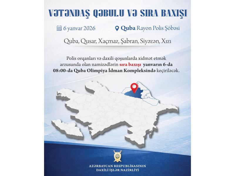 Polis orqanları və daxili qoşunlarda xidmət etmək arzusunda olan namizədlərin sıra baxışı isə vətəndaş qəbulundan öncə, yəni yanvarın 6-da 08:00-da Quba Olimpiya İdman Kompleksində keçiriləcək.